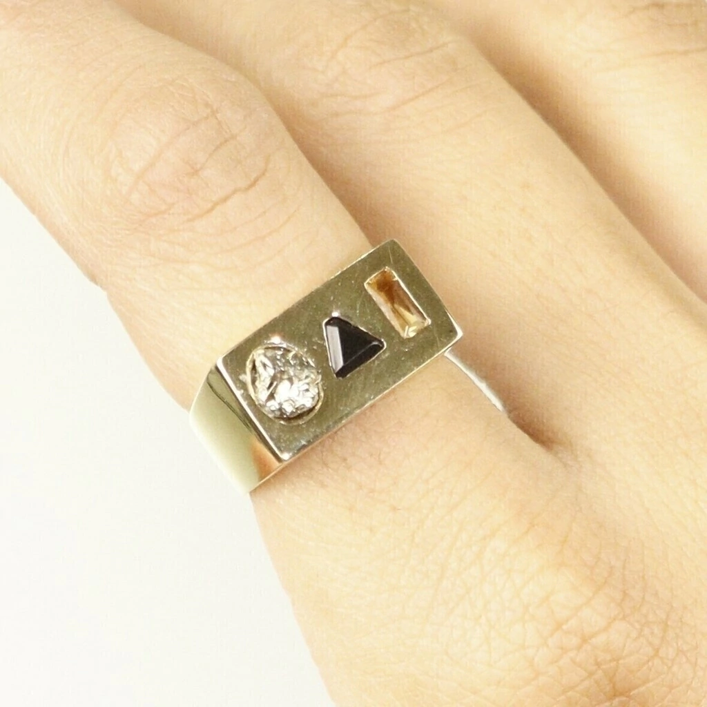 Anel reguável produzido com metais nobres e banho de ouro 18k com pedras Naturais sendo citrino no formato de baguete facetada, ônix triângulo facetado e pirita circular bruta produzido em parceria com Marcela Albertini nossa musa comunicadora e amiga pessoal leonina. Sua coleção por mais que não seja caricata do signo de leão, transmite toda essencia do seu ser brilhante, criativo e único como esta coleção inspirada em sua persona.