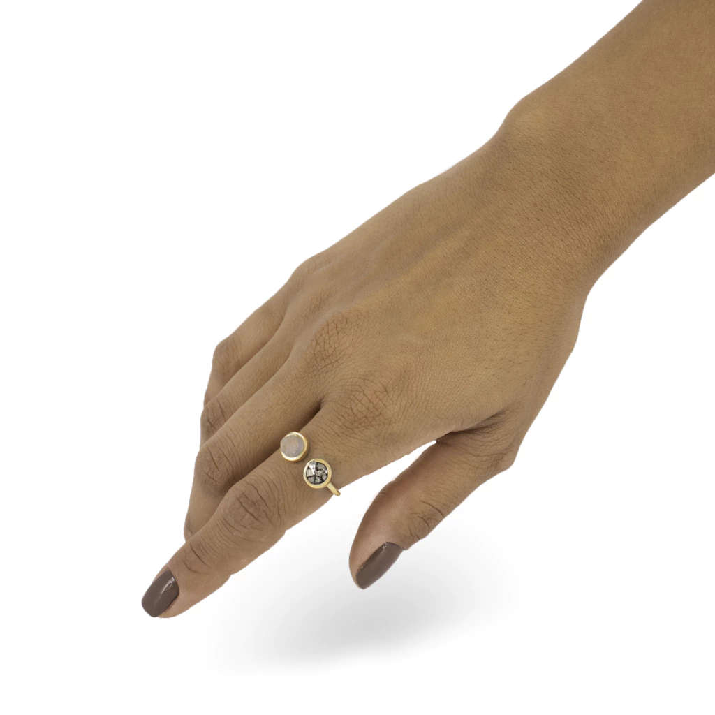 Invista na sua energia com a sofisticação e autenticidade do Anel Regulável de Pirita e Pedra Natural — a joia que celebra sua força serena.