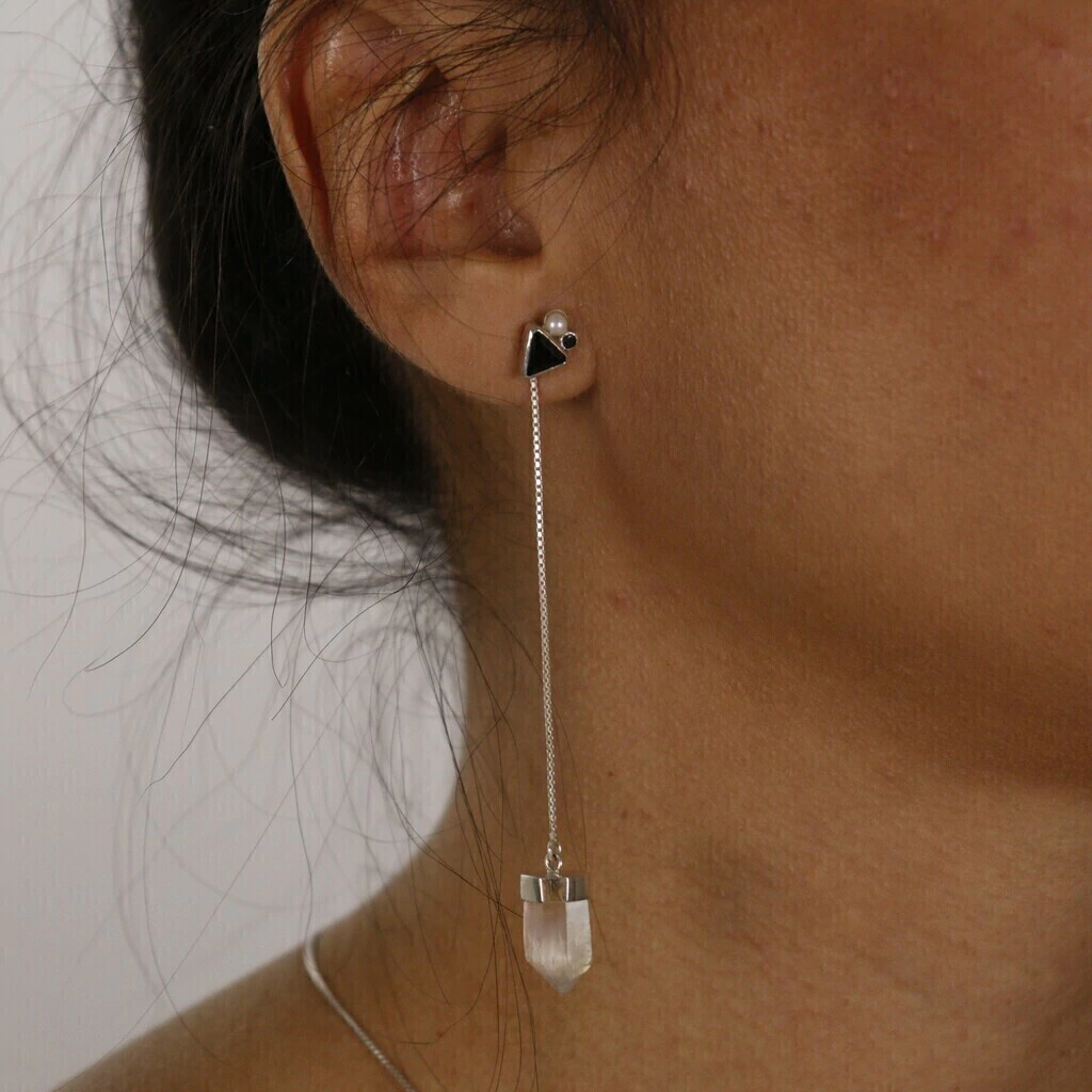 O Brinco Longo em Prata 925 com Pedras Naturais de Ônix, Pérola de Água Doce, Hematita e Cristal é uma peça que une sofisticação e versatilidade. Com um comprimento total aproximado de 7 cm, este brinco oferece diversas possibilidades de uso, adaptando-se ao seu estilo e às suas necessidades.
