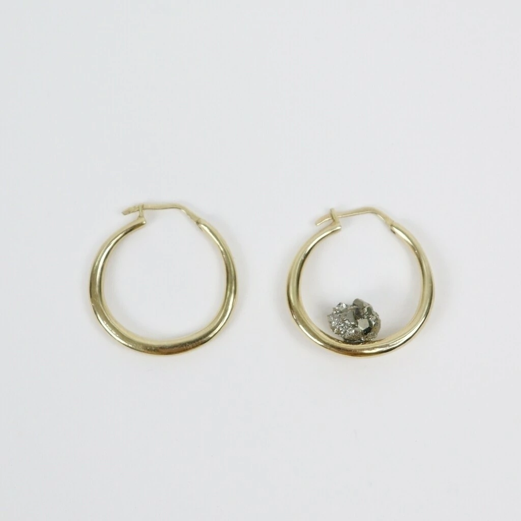 Brinco de argola produzido com metais nobres e com banho de ouro 18k com detalhe em um dos lados em pirita bruta. Produzido em parceria com Marcela Albertini nossa musa comunicadora e amiga pessoal leonina.
