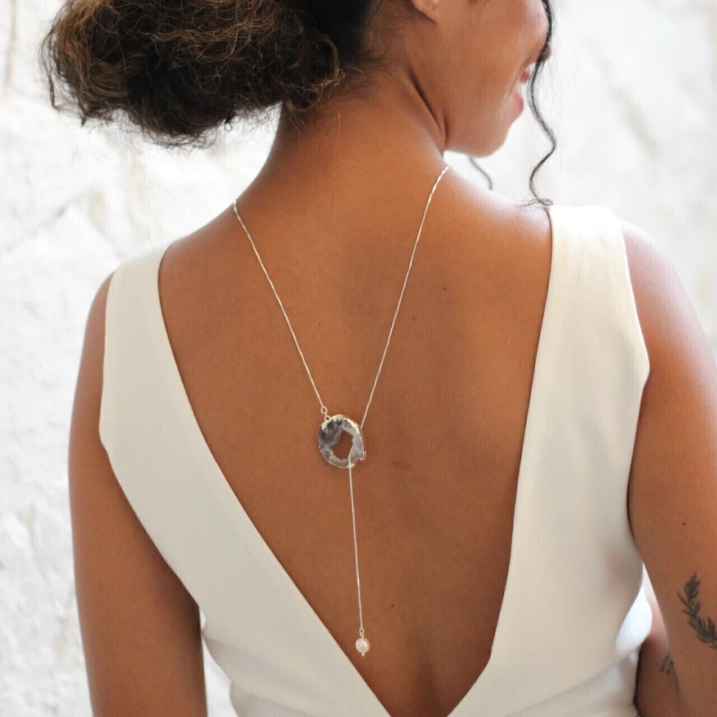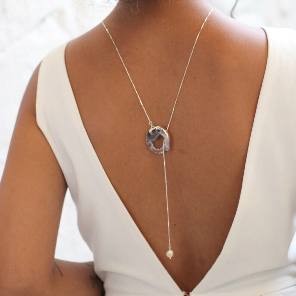 Colar Gravatinha ágata natural com pérola de água doce.