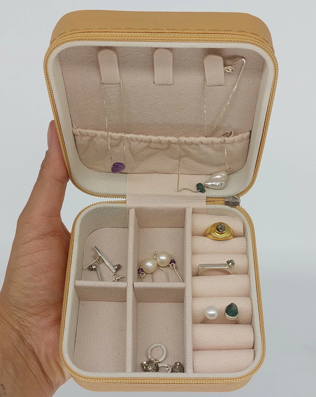 A necessaire organizadora de joias é o acessório perfeito para quem ama manter suas jóas e bijuterias sempre em ordem! Com diversos compartimentos, ela garante que seus colares, brincos e pulseiras fiquem protegidos e à mão, evitando aquele famoso nó nos fios. Feita em material resistente, compacta e fácil de limpar, é ideal para viagens, deixar em casa como porta joais ou carregar na bolsa naqueles dias mais corridos. Não perca mais tempo procurando e desenroscando suas joias! Mantenha tudo organizado e sempre a mão.